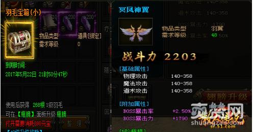 在主线到达一定等级后系统会送给玩家一个羽毛箱子,开启此箱子就会获得一定数量的羽毛。当然这个羽毛箱子需要花元宝来进行开启,并且是有时间限制的,羽毛箱子一共可以开启四次,一共可以获得4888根羽毛其中有一级羽毛与二级羽毛。全部开启后可以直接把翅膀升级到四阶冥凤神翼,而战斗力也会相对应提升。