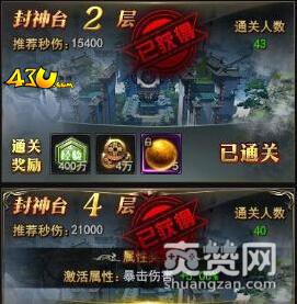 封神台每层只能通关一次,通关奖励非常的丰厚。第一层封神台通关奖励就有200w经验、2w铜钱和5个天将经验丹。到后面无论是铜钱还是经验都会逐层增加,但是经验丹每层只能获取5个。