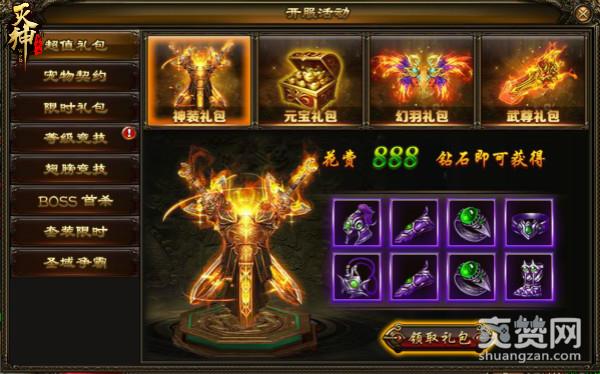 活动期间内玩家可花费少量钻石购买丰厚礼包,礼包可快速提升装备等级、翅膀阶数,更有海量元宝任性使用。