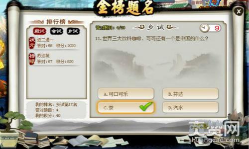 金榜题名需从乡试开始答题,20道题目中,每答对一题,可得10积分、答错或者超时都不得分,连续答对有额外加分。说到这里,不得不提一句,我还有老师教的时候,每每在考试之前,他都会语重心长地说道,审题要仔细,看准了答案再选,千万别粗心大意了。20道题目答完之后,积分达到400可进入会试,达到800可进入殿试,当你在殿试拔得头筹后,金钱、荣誉都将属于你一个人!
