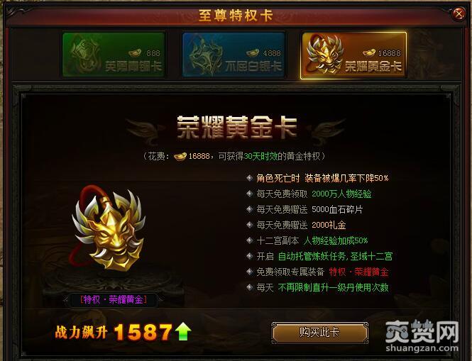购买至尊特权每日上线挂机就可以比别人升级更加快速,每日特权分为三个档次青铜、白银、黄金特权系统每日上线即可获得经验奖励还有大量礼金以及血石,同时你在十二宫副本中获得的经验增加50%,只需消耗少量元宝你就可以成为一个月的黄金大佬!