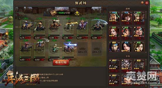 在腾讯《兵法三国》的内城中,包括有议事殿、太学、演武场、税务司、竞技场、群芳阁等诸多建筑,每一个建筑即为一个内政玩法,点击建筑即可开启玩法界面。例如在演武场中,玩家可以选择需要训练的武将或者士兵,持续获得经验收益。