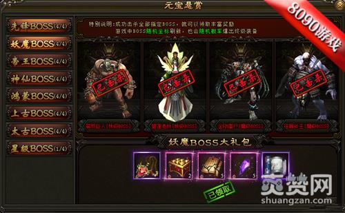 首先,在8090《灭神》元宝悬赏活动中有很多种不同的奖励,先锋BOSS奖励是比较容易获取的,四种小BOSS对于游戏前期的玩家来说都不是什么大问题,有宠物的帮助三两下就能打死啦。第二级的妖魔BOSS就比先锋BOSS要难打一些,不过玩家朋友们可以通过走位来拉BOSS。相同的方法也同样适用于帝王BOSS,神仙BOSS等阶级。