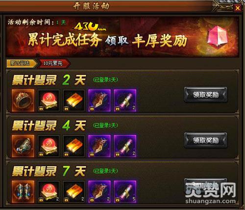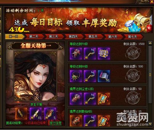 开服竞技活动中,达成每日目标就可以领取丰厚奖励,开服第一天至第七天依次有天劫、神翼、金元素、淬炼、火元素、功勋、钢纹。