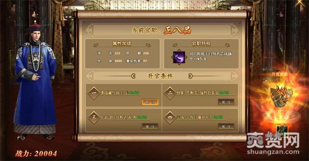 从小小芝麻官升到丞相拥有一人之下万人之上的权利,官职系统不仅是权力的象征更是实力的象征官职每当升级玩家都可以获得更高阶的属性,官职打到一定等级时还可以获得传奇装备激活套装属性使你的战力暴涨,加官进爵享受无尽荣华富贵!