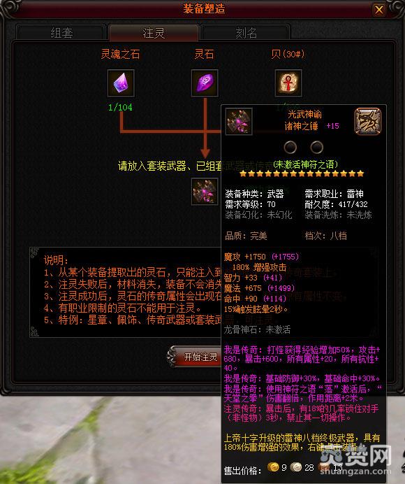 注灵会受到装备部位的限制,即灵石是从哪个部位提取出来的,就要注入到哪个部位的装备上。且需要这件装备是非传奇的套装。
