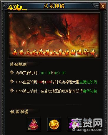 玩家们进入火龙神殿后,主要任务就是击杀在神殿中心的一个BOSS,当BOSS血量到70%和30%的时候,BOSS会掉落大量的坐骑丹,BOSS被击杀后,BOSS掉落大量坐骑丹,装备和羊驼碎片。而且在场的所有玩家都可以获得一份参与礼包,开启礼包可以获得10-20个坐骑丹。