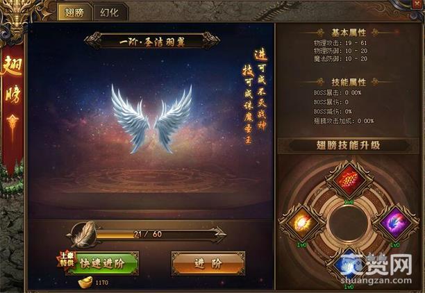 九天玄羽翱翔天际俯瞰大地让异魔无处可藏,玩家到达一定等级时可以获得一个初始的圣洁羽翼但圣洁羽翼需要不断培养才能变成终极羽翼,羽翼可以学习专有的天赋被动技能同样能提供大量的战斗属性,只需激活一个技能战斗属性立马暴涨,秒杀BOSS轻松就可以做到!