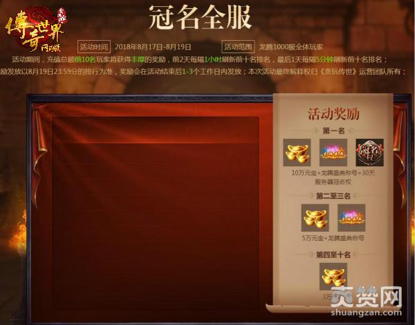 活动期间8月17-19日,充值总额前10名玩家将获得丰厚的奖励,前2天每隔1小时刷新前十名排名,最后1天每隔5分钟刷新前十名排名;