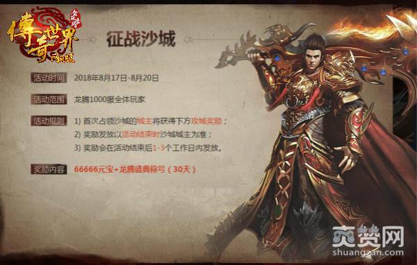 8月17-20日,首次占领沙城的城主将获得攻城奖励66666元宝+龙腾盛典称号(30天),奖励发放以活动结束时沙城城主为准,奖励会在活动结束后1-3个工作日内发放。