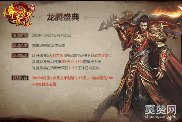 8月17-21日,开服第5天战力前3的玩家将获得战力奖励28888元宝+火华之甲时装(15天)+特戒宝钻*88 +洪荒首饰宝箱,奖励发放以开服第5天23:59分的排行为准,奖励会在活动结束后1-3个工作日内发放。