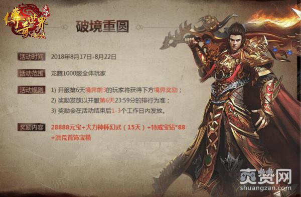 8月17-22日,开服第6天境界前3的玩家将获得境界奖励28888元宝+大力神杯幻武(15天)+特戒宝钻*88 +洪荒首饰宝箱;奖励发放以开服第6天23:59分的排行为准;奖励会在活动结束后1-3个工作日内发放。
