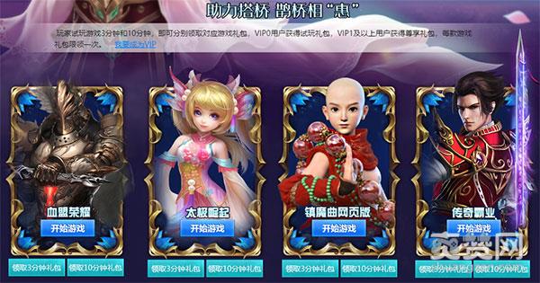活动期间,玩家在活动页面试玩游戏《血盟荣耀》《太极崛起》《镇魔曲网页版》《传奇霸业》3分钟和10分钟,即可分别领取对应游戏礼包,VIP0用户获得试玩礼包,VIP1及以上用户获得尊享礼包,每款游戏礼包限领一次。