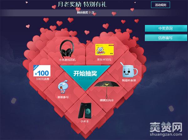 七夕怎么能少得了月老,来参与月老抽奖活动,抱得美人归的同时还可赢取小米8、游戏耳机、京东卡、百元话费……新注册的玩家每天有一次免费抽奖次数;VIP玩家根据等级不同有相对应的免费抽奖次数;免费抽奖次数不足可消耗积分抽奖,每次消耗50积分。