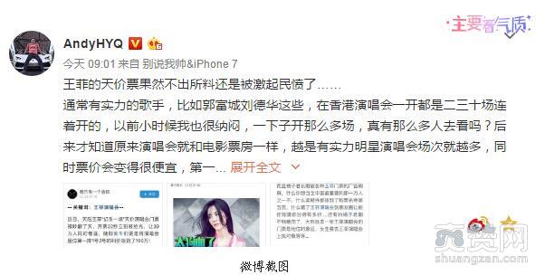 近日,王菲天价演唱会门票引发网友热议。12月28日上午,黄奕前夫黄毅清公开炮轰王菲,他言辞犀利指出王菲拿着傻瓜献给她的钱,和小男朋友潇洒去了。还表示,越是有实力的明星,演唱会场次就越多,而王菲唯一一场演唱会是害怕口碑变坏。