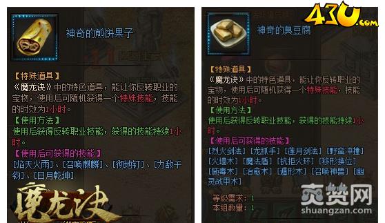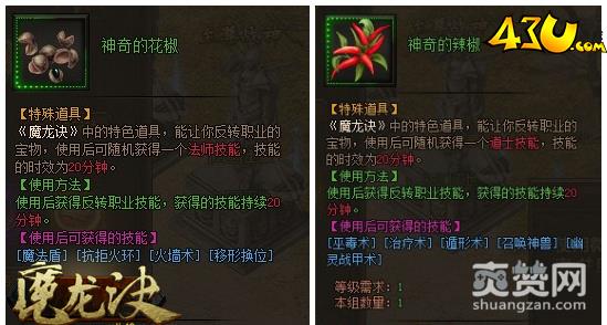 在现实中,麻椒、花椒、辣椒属于调味料,一般人根本下不了口啊,但是在43u《魔龙诀》中,照吃不误哦!麻椒、花椒、辣椒可以让玩家换位体验道士、战士、法师的威力,不过因为是重口味佐料,所以玩家只有20分钟的体验时间哦!话说这三种佐料很容易得到,所以吃完还有呢!