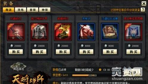 商店中可以进行装备购买,商店刷新次数越多亲密度越高,亲密度高出现高品级装备的概率也就越高。红色品级以上装备附带技能(Lv1~5,增加攻防,兵力,战法强度和攻击力等效果)红色装备最多可拥有1个技能,紫色装备最多可拥有2个技能,橙色装备最多可拥有3个技能。