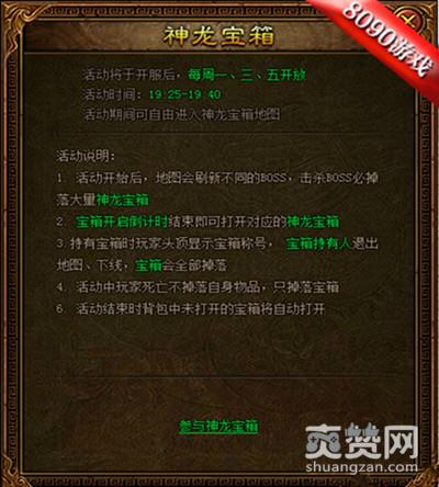以上就是我们的神龙岛的宝箱活动了,想要获得宝箱,玩家们一定要提高自己的战力,宝箱是无归属的,可以自由击杀持宝者,并且获得宝箱,所以这里腥风血雨,是有能者得之。你敢来挑战嘛?如果你有胆,那还等什么?我们在8090《金装传奇》神龙岛等你 。