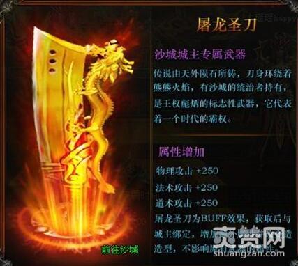 屠龙圣刀其实为一个BUFF效果,当沙城城主获取之后,将会变成绑定的状态,在原来武器的属性上,额外增加BUFF属性值,并改变武器的外形,成为一把名符其实的圣刀。具体的属性加成上,主要是为各项攻击增加250点属性值。