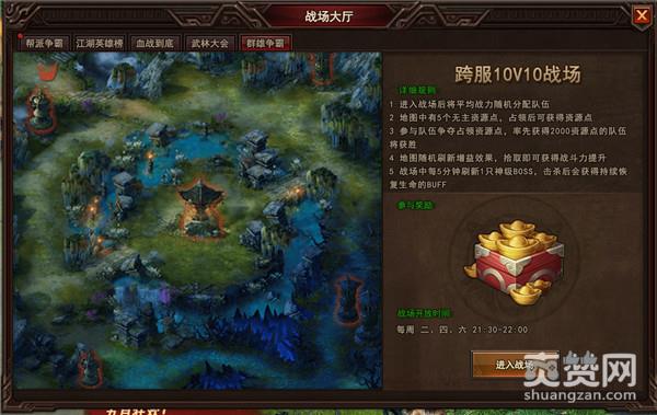 群雄争霸,感受跨服大战场,360uu《太极崛起》群雄争霸战场,为你带来10对10的跨服战场比拼,体验这片江湖成立以来最值得期待的PK,每周二、四、六晚九点准时开战,全新设计的地图与机制,带你感受不同于过去的舞台。在地图中,共分为五个资源点,玩家们需要围绕着资源点的占领展开厮杀,成功占领资源点即可获取点数,率先到达2000点或者在战场结束后资源点多者获胜,莽夫在这里或许不能百战百胜,合理分配人手抢夺资源点才是制胜的关键。