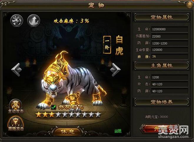 在妖魔入侵的世界中不单单可以击杀妖魔更可以将妖魔收服成为自己的得力助手,猛虎宠物攻击麻痹敌人永久增加主角属性让你的战斗更加轻松,宠物可以通过消耗一定量的元宝升级,等级越高麻痹敌人的几率越大,还可以激活神兽速率提升百分之50的攻击速度,光速平砍砍翻一切BOSS!