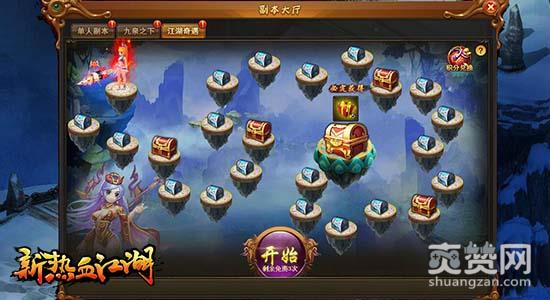 在腾讯《新热血江湖》的副本大厅中,玩家可以看到江湖奇遇的游戏界面,江湖奇遇中有一张平面的游戏地图,其上由24格石阶围绕而成,玩家通过投掷骰子在石阶上方移动。