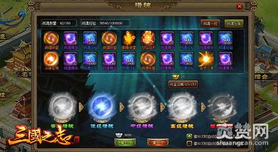 猎魂分为普通、低级、中级、高级、超级五个阶段,猎魂阶段越高,获得高品质战魂的几率也越大,与之对应的,猎魂所消耗的银两也越多。战魂的品质从低到高分别为普通、罕见、稀有、神话、传说。