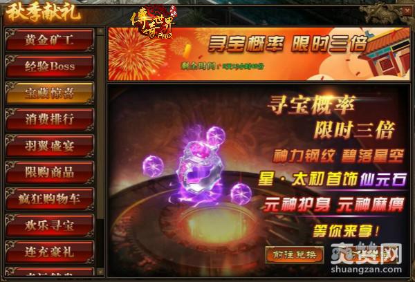 活动期间,玩家寻宝概率翻倍,极高几率获得星?太初首饰,仙元石、碧落星空,神力特戒钢纹,元神护身特戒以及元神麻痹特戒。