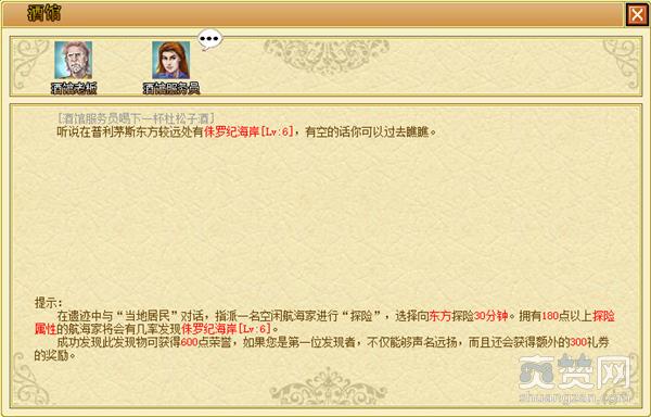 探索侏罗纪海岸要求航海家至少拥有180以上的探险属性值,并且除了探险值外,航海家在探险中消耗的时间还应达到30分钟,如果航海家可以满足这些条件,将有机会找到这个发现物,获取荣誉值与经验值,并有机会得到额外的礼券奖励。