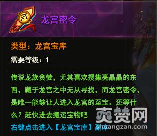 43u《龙神契约》龙宫宝库是一个游戏中比较隐藏的副本,在这个副本里,我们可以获得装备、材料、金钱,要进入的玩家必须要有龙宫密令。每日可以进入3次,进入可以获得100万左右的金币。
