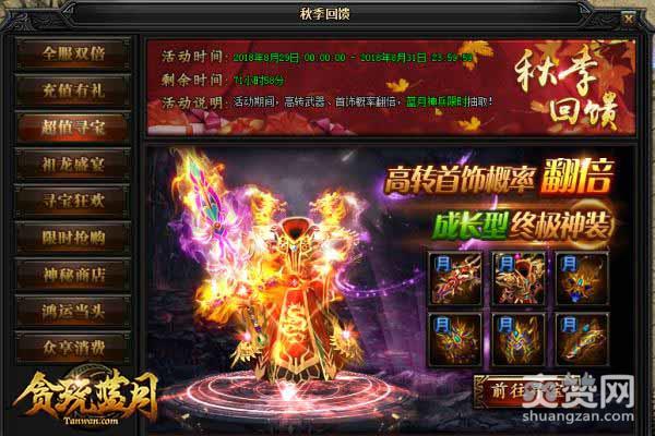 先来看看贪玩蓝月送你的第一大暑假福利,8月29日~8月31日,《贪玩蓝月》秋季回馈福利来袭,9大惊喜活动享不停。活动第一天,全服双倍经验活动全天开启,海量经验轻松得。超值寻宝,高转武器、首饰概率翻倍,蓝月神兵限时抽取!而且在龙族寻宝中,每寻宝5次,可额外获得1点祖龙之力,获取无上限,寻宝次数达指定次数,更有额外大礼。累积消费指定元宝还可以领取海量奖励,你还在等什么呢?