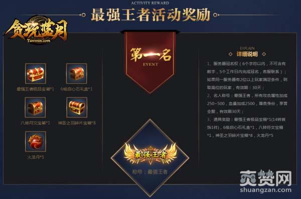 8月29日~8月31日,贪玩蓝月最强王者活动来袭,活动期间,消费总额满50万元宝的玩家(前十名)将把自己的名字载入蓝月传奇”最强王者”史册,并获得丰厚的奖励,排名第一的玩家可获得“最强王者”限量版名人称号,更有最强王者极品宝箱、6级启心石礼盒、八转符文宝箱等海量珍稀道具奖励,你还在等什么?