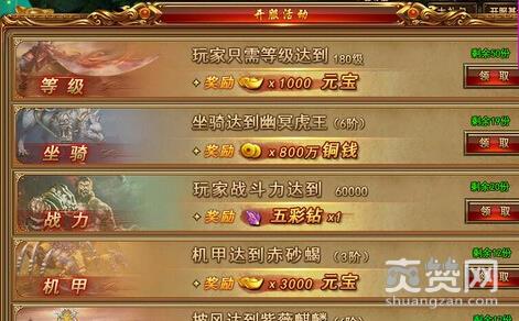 玩家点击头像角色名右下角的图标,上面写着达到180级可以领元宝。打开之后可以看到所有的奖励,包括到达180级领取1000元宝,坐骑达到幽冥虎王领取800万铜钱,战力达到60000领取五彩钻一个,都是非常不错的奖励。