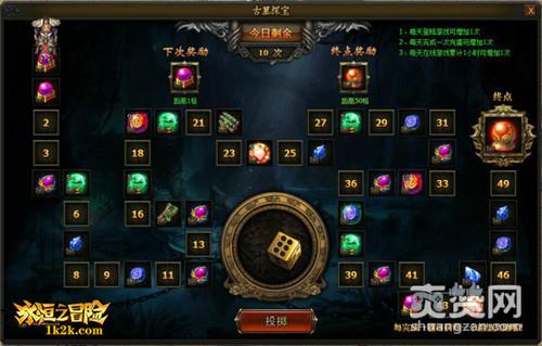 1k2k《永恒之冒险》全新古墓探宝玩法,每天上线就能买费掷骰子一次,骰子点数多少就会跳多少格,会有翅膀提升丹、成就秘籍、魂珠结晶、宝石结晶、护盾结晶、高级转生卷轴、魔龙卷轴等你来拿,每50格会有超级BOSS积分奖励你哦!古墓探宝每完成一次充值或在线累计1小时就会增加一次哦,很快终极大奖就会收你进的包裹!