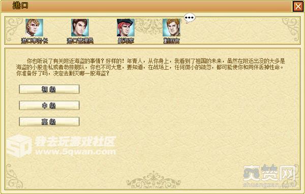 在剿匪官那里,一共有初、中、高三个等级的剿匪任务。不过新手不要被任务的等级给迷惑。事实上,剿匪官任务里的敌人都是一小股的海盗,很容易对付。此外,因为敌人就在港口附近,航海家还可以省去许多移动的时间。新手可以通过这个任务积累大量战斗经验,快速提升自身等级。
