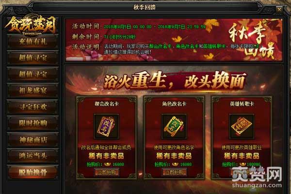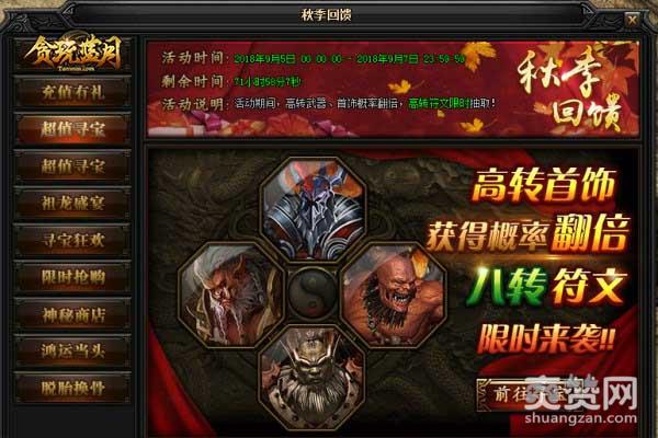 《贪玩蓝月》的玩家若想稳稳地凌驾对手之上,除了要靠自己的勤奋,更要有一波惊喜福利助攻,9月5日~9月7日,《贪玩蓝月》秋季回馈福利再度来袭,8大惊喜活动享不停。活动第一天,全服双倍经验活动全天开启,海量经验轻松得。还有超值寻宝福利,高转武器、首饰概率翻倍,高转符文、极品图腾限时抽取!