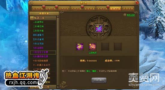 在游戏制造功能的暗器合成界面中,玩家可以使用不同的暗器碎片来逐步合成对应品质的暗器,低阶暗器作为高阶暗器合成材料,在合成时无损保留强化镶嵌等属性。暗器合成的材料暗器碎片可以通过每日的单人暗器副本获得,想要更快速的打造出高阶暗器,千万不要忘了扫荡副本哦!