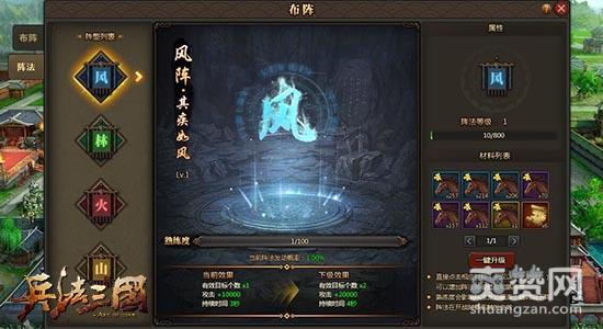 腾讯《兵法三国》的布阵功能中全新加入了阵法升级玩法,玩家可以对自己的“风、林、火、山”四只阵型分别进行升级,升级后对应阵型在战斗时将触发不同能力。