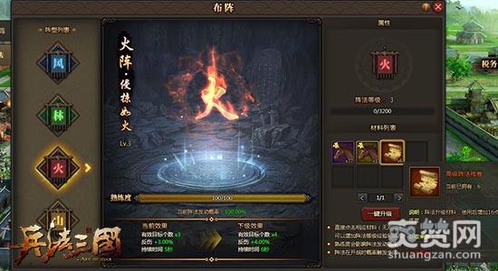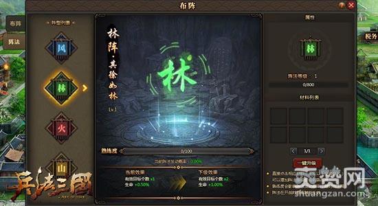 不同阵型升级获得的能力各不相同,风阵效果为攻击加成、林阵效果为生命加成、火阵效果为反伤加成、山阵效果为怒气加成。