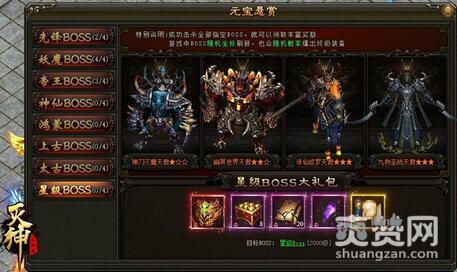 元宝悬赏中的BOSS分为八个部分,分别是先锋、妖魔、帝王、神仙、鸿蒙、上古、太古和星级。每部分有4个BOSS驻守,成功击杀全部指定BOSS,就可以获得面板正下方显示的BOSS大礼包。需要注意的是,BOSS都是随机刷新,所以这时候人品就很重要了。