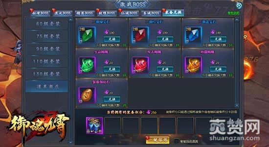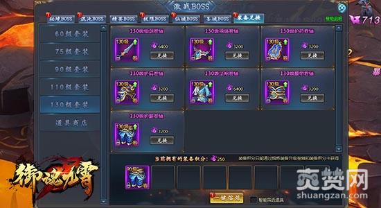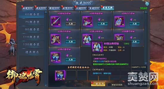 在腾讯《御魂九霄》的激战BOSS界面中,可以查看装备兑换功能。玩家可以在该处兑换60级、75级、90级、110级、130级全部整套紫色装备,以及各种宝石、精魄等道具。