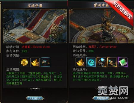 最后是皇城争霸。活动时间是合服第二天 20:00-21:00,参与条件:85级。一般为每周二、五自动开启活动期间玩家可以尽情的战斗,在活动中占领皇宫,成为霸主,赢得专属称号,帮助将获得霸主宝箱。