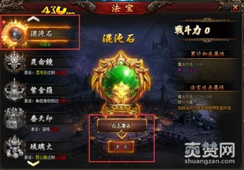 43u《天威传说》玩家们可以在界面下方点击“法宝”按钮或按下快捷键(O)进入系统,法宝界面左侧显示法宝的名称、激活条件及是否激活是否出战的状态;界面正中显示法宝展示图及其是否可激活、是否出战;界面右侧显示法宝的战斗力、累计加成属性、法宝攻击属性。