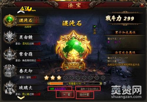 法宝升星需要消耗“法宝升星丹”,玩家点击“升星”按钮后,会自动升星一次。玩家点击“自动升星”按钮后,会消耗玩家背包中所有“法宝升星丹”进行相应次数的升星。勾选道具不足自动购买,会在玩家点击“升星”或“自动升星”后,自动用元宝购买缺失的“法宝升星丹”。每次升星有几率直接升星成功。升星失败会增加祝福值。祝福值越高,下次升星成功的几率越大。