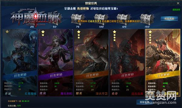 每个37《神魔血脉》的玩家每天只能领取5次任务,也就是将每一只怪物都刷一遍啦!如果你既达不到200级,也没有VIP10,其实还可以消耗银币来对怪物进行刷新,不过银币刷新的效果自然没有钻石的效果好,这就要玩家自己去权衡啦!