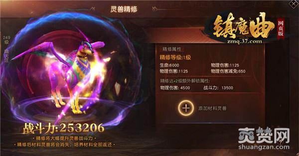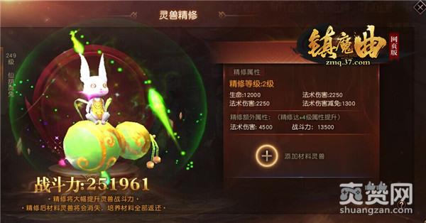 在37《镇魔曲网页版》中,当玩家达到140级时即可开启灵兽精修,灵兽精修系统可让灵兽吸收灵兽,以提升灵兽自身的精修等级以及提高主灵兽的属性与战斗力,但要注意,灵兽精修时,材料灵兽与主灵兽必须一致,否则不能进行精修。