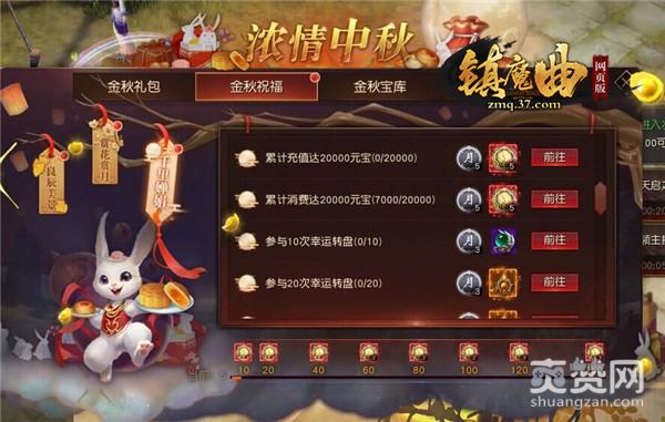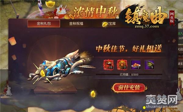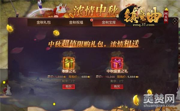 在37《镇魔曲网页版》参与【中秋宝库】的玩家,在活动期间可购买寒蝉之礼和中秋盛宴之礼两种超值限购礼包,内容十分丰富,而且包含稀有材料;而最后一个活动【中秋瑰宝】,参与该活动的玩家只要在活动期间累计消费达5000元宝(充值元宝和绑定元宝均可),即可登金秋瑰宝榜,领取丰厚的奖励。