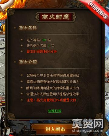 离火封魔,游戏中练级速度非常快的一个副本,一定要每天优先完成离火封魔,建议大家不用扫荡,毕竟扫荡需要大量的扫荡令,虽然挂机可以获得扫荡令,但是数量并不是很多,长时间的积累可以扫荡一次副本就不错了,还是注意多多参与就可以了,每天可以完成两次。