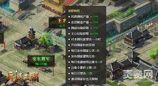 不同官位可以为玩家提供对应的官职特权,例如国王可以享受到:铜钱产量加成、粮食产量加成、国战功勋加成、主公经验加成、世界聊天禁言、开启国家科技、发布国家建筑任务等在内共12个超级特权!