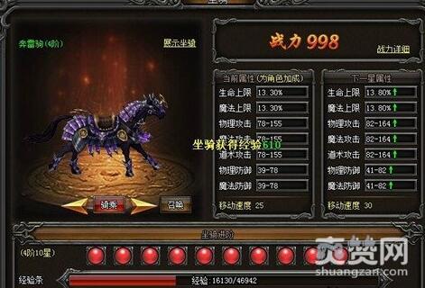 坐骑可以进行升级,升级可以提升坐骑的造型和属性。坐骑可以在坐骑提升系统进行升级培养,系统每天提供三次免费提升,之后需要消耗“坐骑提升丹”一个,或是用元宝代替。坐骑提升的基础经验为720,运气好的话还有可能出现小暴击或大暴击!